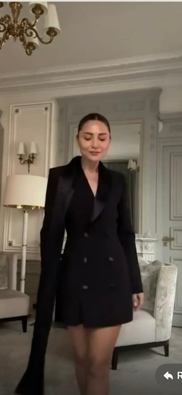 Command attention with this tailored mini jacket dress—a bold fusion of power dressing and high fashion. Featuring a double-breasted front, structured shoulders, and a sleek silhouette, it delivers instant polish with a modern edge. The standout detail? An attached scarf that drapes elegantly from the neckline, adding movement and a touch of drama to your stride. Crafted from premium suiting fabric with a hint of stretch, this dress offers both comfort and confidence. Perfect for evening events, gallery openings, or any moment that calls for unapologetic style.