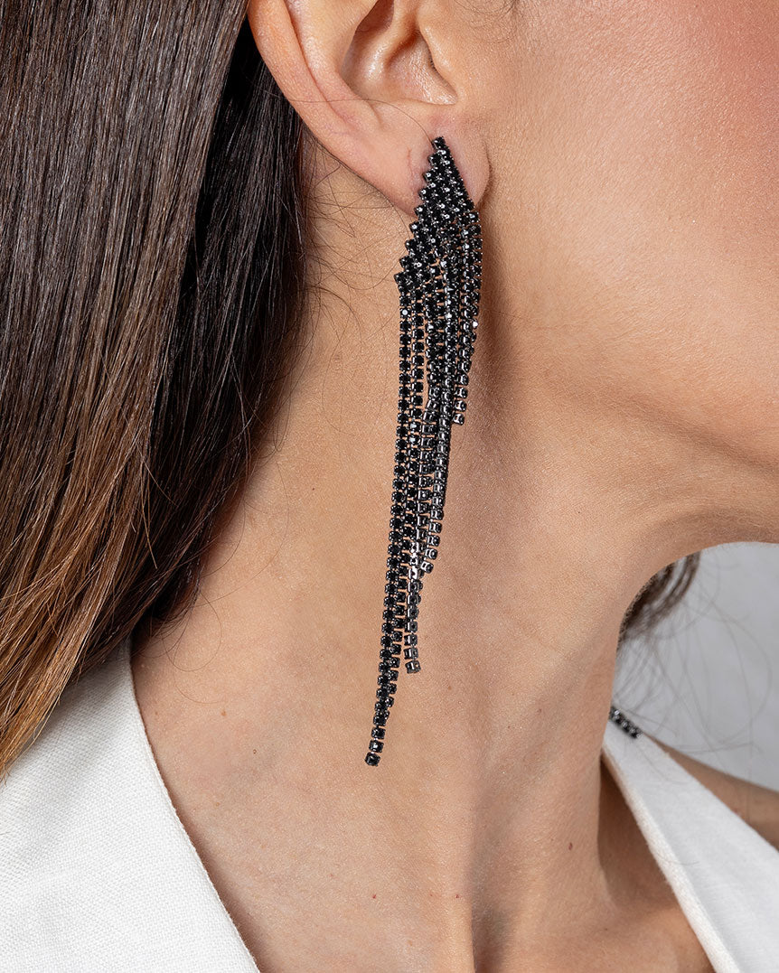 Add a touch of edgy elegance with our Midnight Cascade Earrings. Delicate threads of tiny black stones cascade asymmetrically beneath the ear, creating a striking play of texture and movement. The contrast of the dark shimmer against your skin makes these earrings a bold statement piece—perfect for elevating evening looks or adding a touch of drama to everyday style. Lightweight and fluid, the Midnight Cascade Earrings blend modern sophistication with a hint of mysterious allure.