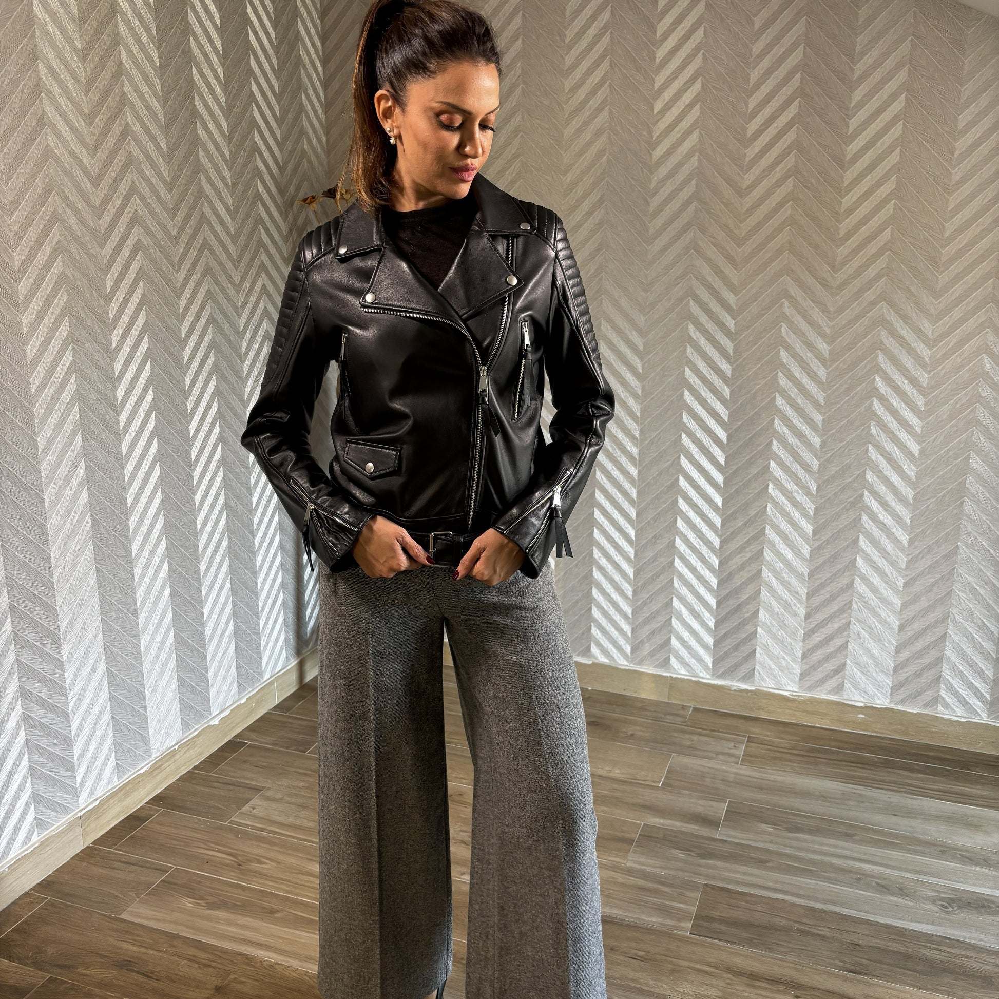 Bold, iconic, and effortlessly stylish, the Noirvane biker jacket is a wardrobe essential for modern sophistication. Crafted from premium black leather, it features a classic biker silhouette with structured lines and durable hardware, offering both style and functionality. Perfect for layering over dresses, knits, or casual separates, Noirvane delivers an edgy, confident statement while maintaining a polished, refined look.