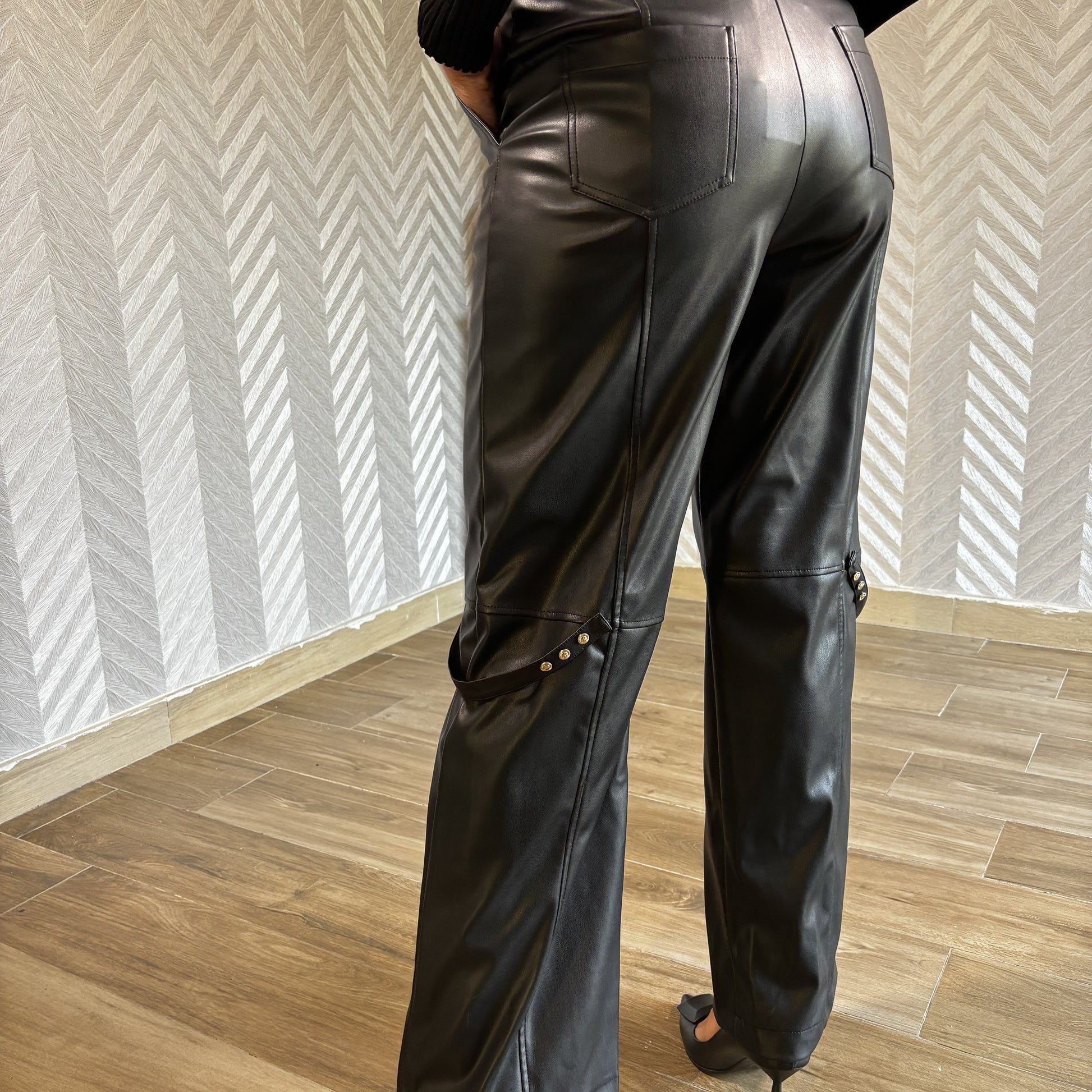 Sleek, confident, and contemporary, the Ravine pants embody bold sophistication. Made from premium black leather, they feature a straight-cut silhouette that elongates the legs while maintaining a structured, refined look. Small adjustable belts around the lower part of each leg add a distinctive edge, creating a subtle statement that’s both modern and versatile. Perfect with blazers, knits, or heels, Ravine delivers a seamless balance of luxury and attitude.
